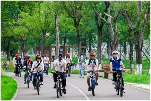 直播記錄下了外媒記者們騎行打卡世界規(guī)模最大的綠道系統(tǒng)——天府綠道核心“一軸”錦江綠道的全程:從鳥語花香的桂溪生態(tài)公園出發(fā),在綠樹掩映的婚姻登記所簽訂“城市婚書”,在亞洲最大單體建筑新世紀環(huán)球中心南側濕地學習四川話,在錦城湖4號湖畔撞線……