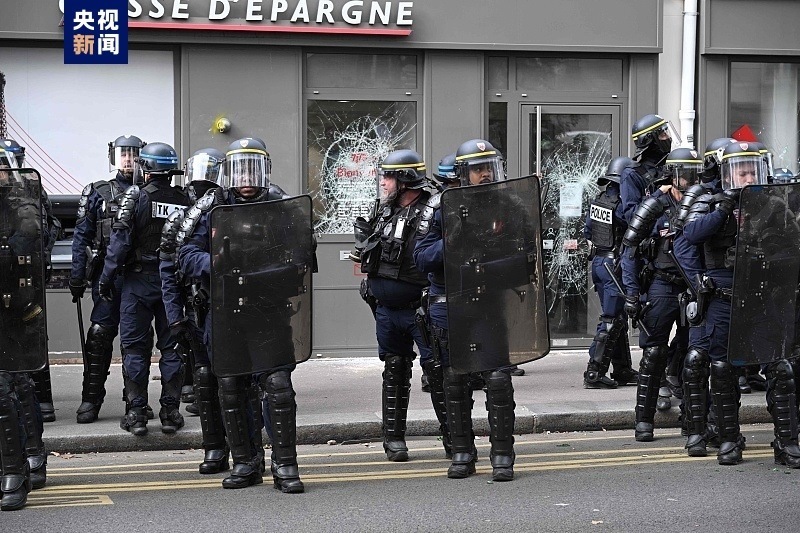 在法國(guó)首都巴黎,游行隊(duì)伍下午3點(diǎn)左右從北站平靜出發(fā)后,隨后一個(gè)由數(shù)百名蒙面男子組成的隊(duì)伍破壞了銀行機(jī)構(gòu)的櫥窗,并向一輛警車投擲石塊。巴黎警察局稱,這輛汽車遭到“鐵棍”的打擊。車上一名警察手持武器下車,以便與示威者保持距離。一支摩托車警察部隊(duì)隨后趕來(lái),阻止了破壞行為并保護(hù)了車上的警察。
