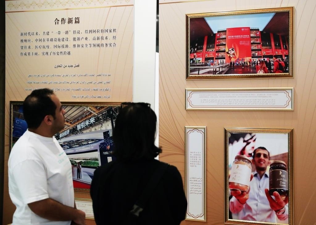 ?2022年12月7日,人們?cè)谏程匕⒗锥祭诺门e辦的中阿友好合作交流展上參觀。新華社記者王東震攝