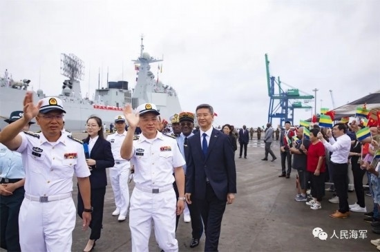當(dāng)日上午9時,懸掛著中加兩國國旗的編隊艦艇緩緩靠泊奧文多港碼頭,中國駐加蓬大使李津津及使館工作人員、當(dāng)?shù)刂匈Y機構(gòu)人員、華人華僑代表,加蓬國防部秘書長彭吉中將及官兵代表等300余人位碼頭迎接。