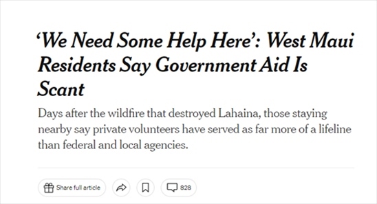 《紐約時(shí)報(bào)》8月13日發(fā)表報(bào)道稱,毛伊島野火造成2200多幢建筑倒塌,許多受災(zāi)居民缺少熱食、飲用水和庇護(hù)所。災(zāi)難發(fā)生后,當(dāng)?shù)刂驹刚呓M成了比聯(lián)邦和地方機(jī)構(gòu)更可靠的“生命線”。有居民表示,從聯(lián)邦和地方政府手中得到的救助遠(yuǎn)沒(méi)有從私人志愿者處得到的多。