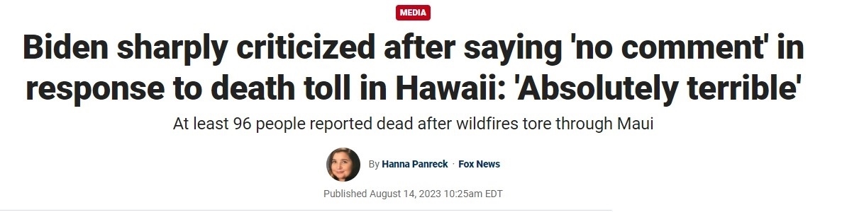 福克斯新聞網(wǎng)8月14日?qǐng)?bào)道稱,當(dāng)?shù)貢r(shí)間13日上午,毛伊島救災(zāi)仍在進(jìn)行,美國(guó)總統(tǒng)拜登卻在其位于特拉華州里霍伯斯海灘的海邊別墅過(guò)周末。當(dāng)被問(wèn)及毛伊島大火造成的死亡人數(shù)正不斷上升的問(wèn)題時(shí),拜登表示“不予置評(píng)”。