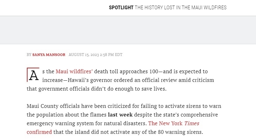 據(jù)悉,夏威夷毛伊島部署有80個(gè)警報(bào)器,但是在此次野火來(lái)襲過(guò)程中,警報(bào)器并未響起。安達(dá)亞16日曾表示,他并不后悔沒(méi)有拉響警報(bào)器,因?yàn)榫瘓?bào)器通常是用來(lái)警示海嘯的,反而可能導(dǎo)致很多民眾逃向內(nèi)陸地勢(shì)較高處,從而進(jìn)入火海。這一表態(tài)激起了廣泛爭(zhēng)議和批評(píng)。