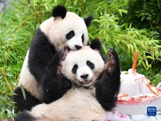8月31日,大熊貓“夢(mèng)想”(左)和“夢(mèng)圓”在德國柏林動(dòng)物園享用“生日餐”。當(dāng)日,在德國出生的大熊貓雙胞胎兄弟“夢(mèng)想”和“夢(mèng)圓”迎來4歲生日,柏林動(dòng)物園為它們舉辦了慶?;顒?dòng)。新華社記者 任鵬飛 攝