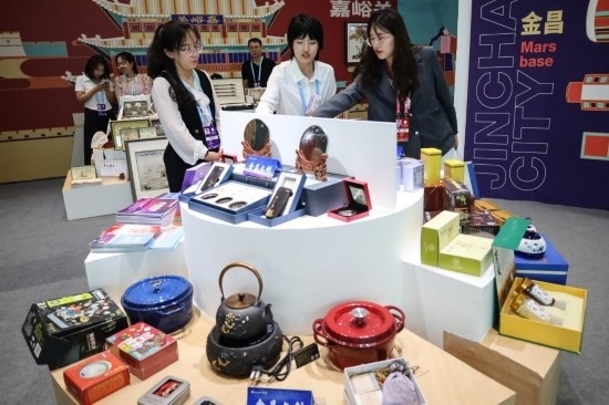 9月6日,與會(huì)嘉賓在第六屆絲綢之路(敦煌)國際文化博覽會(huì)上參觀文創(chuàng)產(chǎn)品和文旅裝備展銷活動(dòng)。新華社記者 馬希平 攝