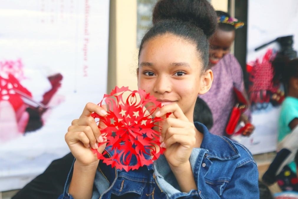 9月23日,盧旺達(dá)首都基加利,在盧旺達(dá)大學(xué)孔子學(xué)院舉辦的“中國(guó)文化進(jìn)校園”暨中秋國(guó)慶慶?;顒?dòng)現(xiàn)場(chǎng),一名女孩展示剪紙成果。(新華社發(fā),黃萬(wàn)晴攝)