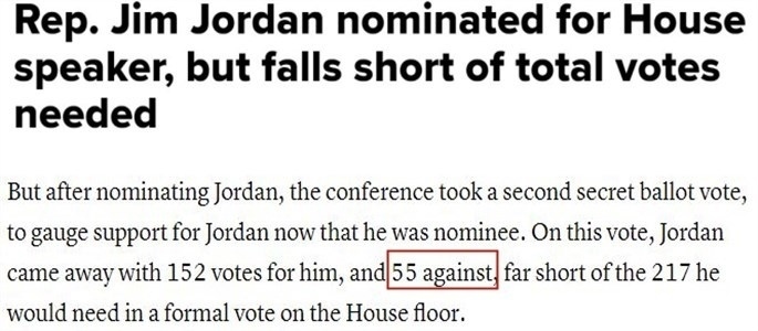 據(jù)報道,喬丹13日贏得提名后,共和黨人立刻舉行了第二輪閉門投票,以檢驗喬丹所獲黨內(nèi)支持情況。結果顯示,152名共和黨人將在全院表決中投贊成票,55名共和黨人將投反對票。
