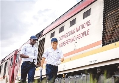 在肯尼亞內(nèi)羅畢,非洲之星鐵路運(yùn)營(yíng)公司機(jī)輛部的火車(chē)駕駛員(右)與學(xué)員從蒙內(nèi)鐵路機(jī)車(chē)旁走過(guò)。新華社記者 王冠森攝
