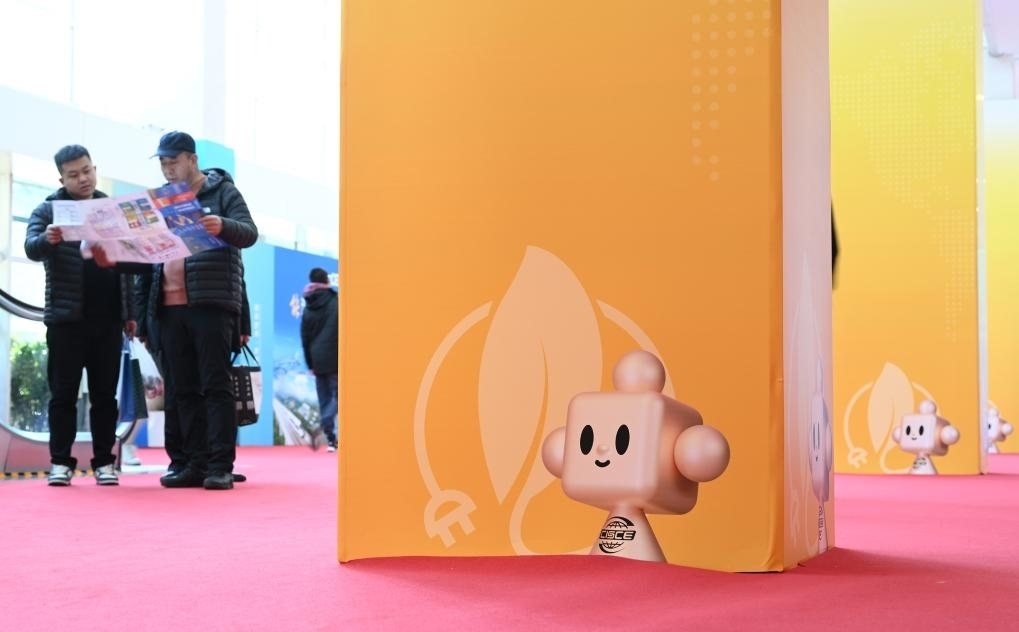 ?11月29日,通往鏈博會會場通道處的立柱上帶有醒目底色的“鏈氪”形象標識引導參觀人群。新華社記者 李賀 攝