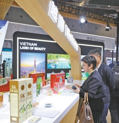 11月6日,參觀者在第六屆進(jìn)博會(huì)國(guó)家展越南展臺(tái)挑選商品。新華社記者 李夢(mèng)嬌攝