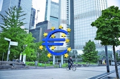 7月27日,一名男子騎車(chē)經(jīng)過(guò)德國(guó)法蘭克福的歐元標(biāo)志。新華社發(fā)