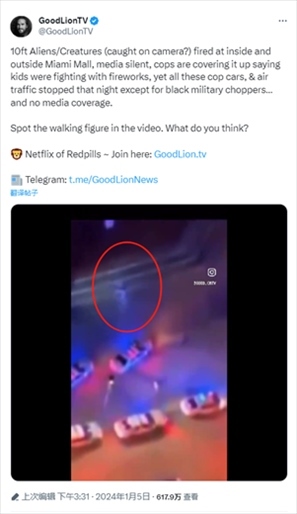 報(bào)道提到,一個(gè)推廣涵蓋科幻、陰謀論等內(nèi)容電影和紀(jì)錄片的X平臺(tái)賬號(hào)曬出現(xiàn)場視頻稱,“10英尺高的外星人/生物(被攝像機(jī)拍到?)朝邁阿密購物中心內(nèi)外開火,媒體沉默,警察掩蓋說孩子們?nèi)挤艧熁ú⒋蚨?,然而除了黑色軍用直升機(jī),所有警車和空中交通都在那天晚上一動(dòng)不動(dòng)……這卻沒有媒體報(bào)道。視頻中出現(xiàn)了行走的身影。你覺得呢?”↓