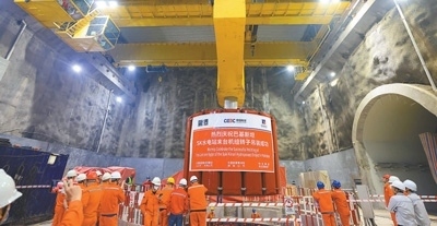 2023年6月10日,工人在巴基斯坦蘇吉吉納里水電站吊裝最后一臺機組轉(zhuǎn)子。中國能建葛洲壩海投公司供圖