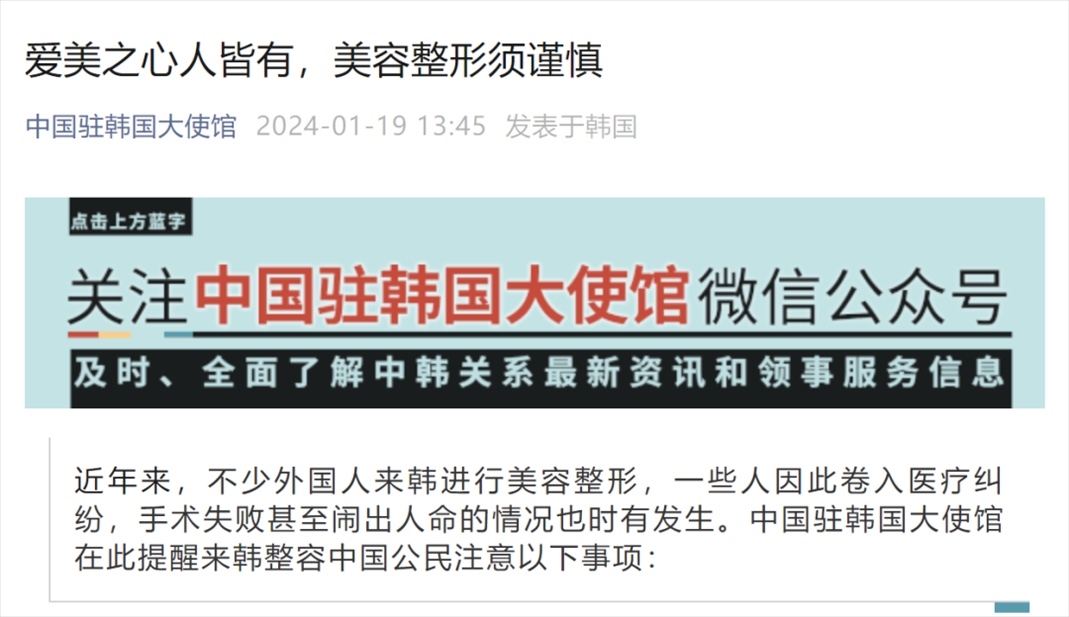 1月19日,中國(guó)駐韓國(guó)大使館提醒來(lái)韓整容中國(guó)公民注意以下事項(xiàng):