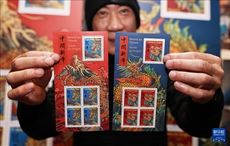 這是1月26日在法國巴黎拍攝的龍年生肖紀念郵票。新華社記者 高靜 攝