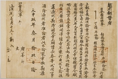 853年,圓珍入唐,先后在福州開(kāi)元寺、天臺(tái)山國(guó)清寺、長(zhǎng)安青龍寺等地修學(xué)。858年,圓珍攜大量經(jīng)卷、法器等回到日本,被尊為三井寺第一代住持,并成為日本天臺(tái)宗寺門派創(chuàng)始人。在唐求法期間,圓珍與各界人士結(jié)下深厚友誼。圓珍的親身經(jīng)歷以及他和唐朝人士的往來(lái)信件等,成為中日文化交流的歷史見(jiàn)證。