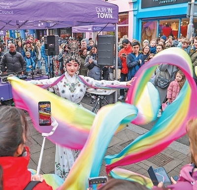 2月11日,2024年愛爾蘭“歡樂春節(jié)”活動(dòng)在首都都柏林開幕。圖為川劇《天女散花》表演。