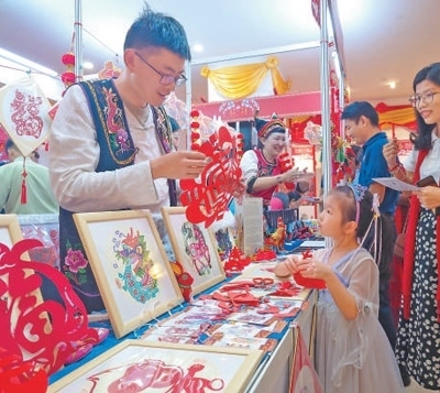 日前,在緬甸仰光舉辦的“歡樂春節(jié)·新春集市”活動(dòng)現(xiàn)場(chǎng),工作人員在展示剪紙作品。