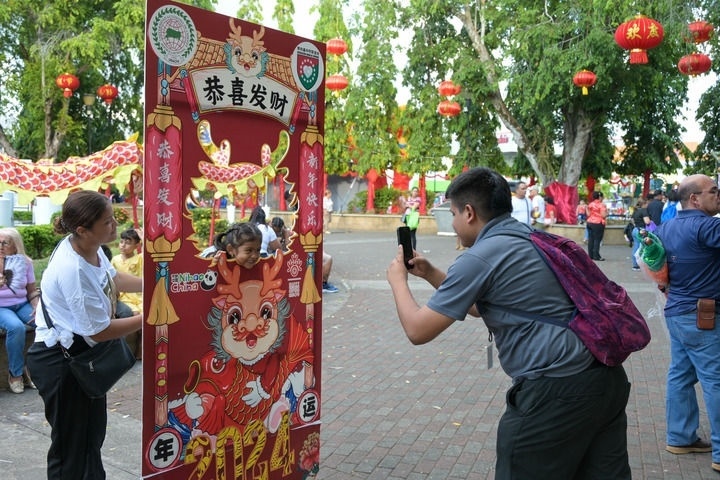 2月16日,在巴拿馬奇里基省首府戴維市,游客在春節(jié)照相框處拍照留念。新華社記者陳昊佺攝