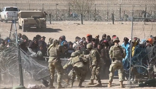 視頻畫(huà)面顯示,大批成年男性沖破州政府設(shè)置的鐵絲網(wǎng),將得州國(guó)民警衛(wèi)隊(duì)的一些士兵撞倒,并跑向邊界墻。 現(xiàn)場(chǎng)一片混亂,可以聽(tīng)到有士兵對(duì)移民大叫“滾回去!”
