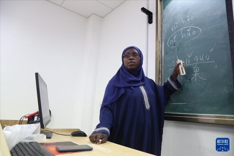 2023年11月17日,在坦桑尼亞達(dá)累斯薩拉姆大學(xué)孔子學(xué)院,本土中文教師在給學(xué)生授課。新華社發(fā)(赫爾曼·埃馬紐埃爾攝)