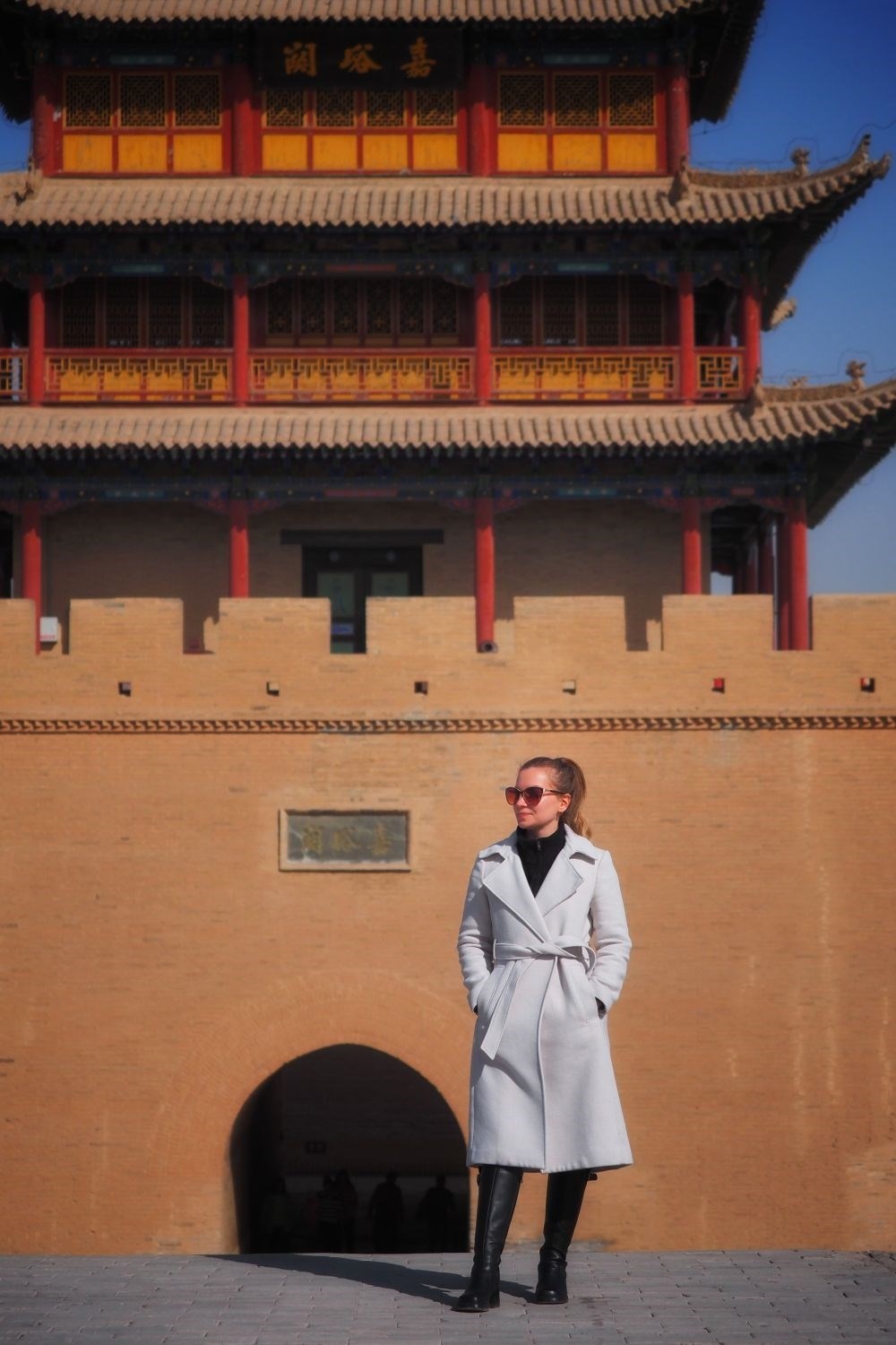 3月14日,新華社外籍記者達(dá)莎在甘肅嘉峪關(guān)城樓前。新華社記者趙宇攝