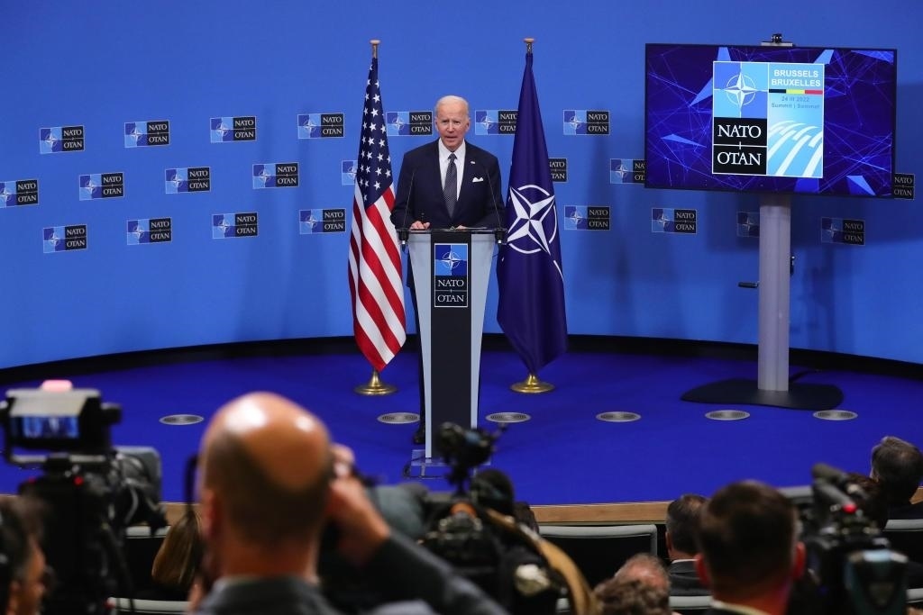 ?2022年3月24日,美國總統(tǒng)拜登在比利時布魯塞爾的北約總部出席北約特別峰會后的新聞發(fā)布會。新華社記者鄭煥松攝