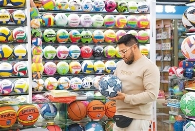 浙江省義烏國(guó)際商貿(mào)城,來(lái)自厄瓜多爾的外商在選購(gòu)球類。時(shí)寬兵攝(人民視覺(jué))