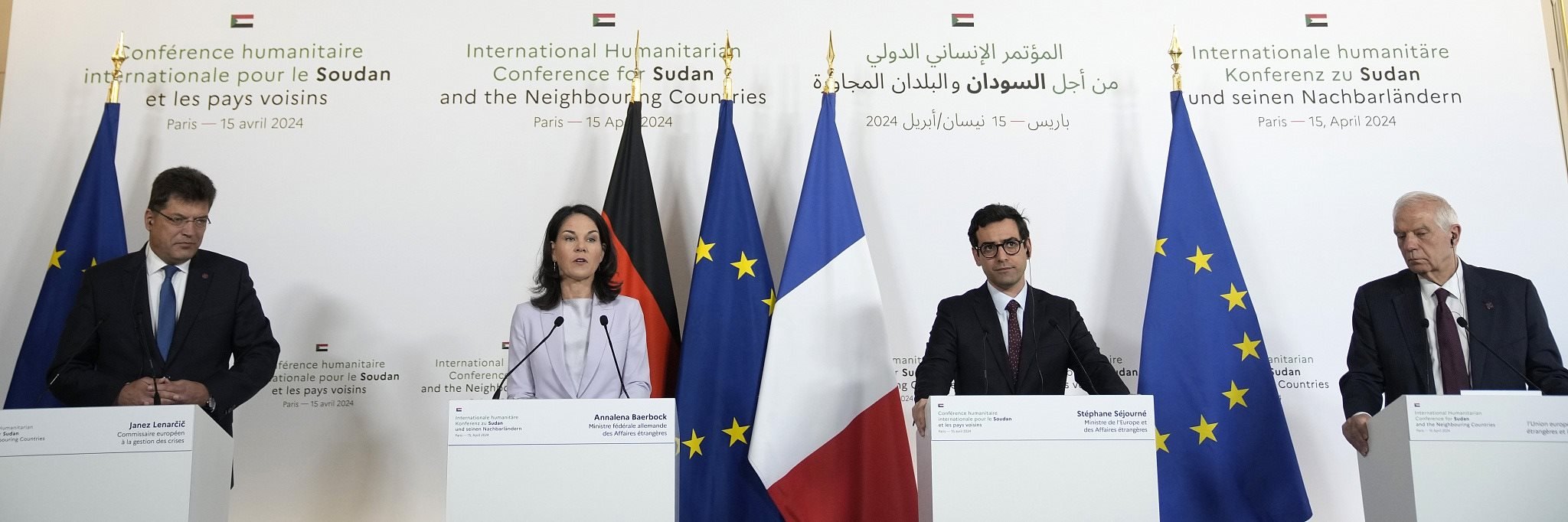 當(dāng)?shù)貢r(shí)間2024年4月15日,法國巴黎,法國外交部長斯特凡納·塞茹爾內(nèi)(右二),德國外交部長安娜萊娜·貝爾伯克,歐盟危機(jī)管理專員約翰·萊納西奇(左)和歐盟外交與安全事務(wù)高級(jí)代表何塞普·博雷利參加了蘇丹及其鄰國國際人道主義會(huì)議的聯(lián)合新聞發(fā)布會(huì)。
