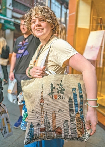 在上海豫園商城內(nèi),馬斯卡廷中學(xué)學(xué)生展示選購(gòu)的商品。王 初攝(人民視覺(jué))