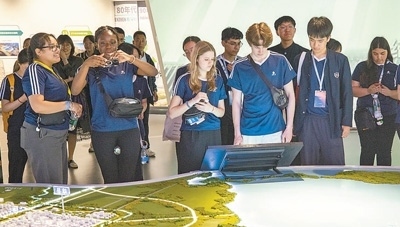 在河北雄安新區(qū)“雄安印象”展館,馬斯卡廷中學(xué)學(xué)生與石家莊外國(guó)語(yǔ)學(xué)校學(xué)生觀看雄安新區(qū)規(guī)劃示意模型。