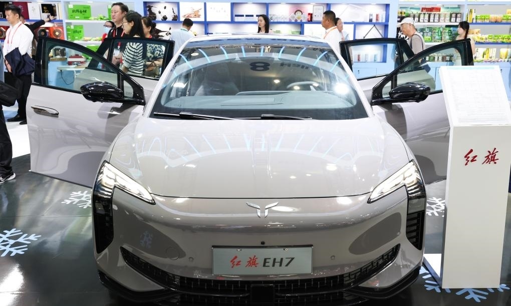 ?這是在第四屆中國國際消費品博覽會上展出的紅旗新能源汽車(2024年4月13日攝)。新華社記者楊冠宇攝