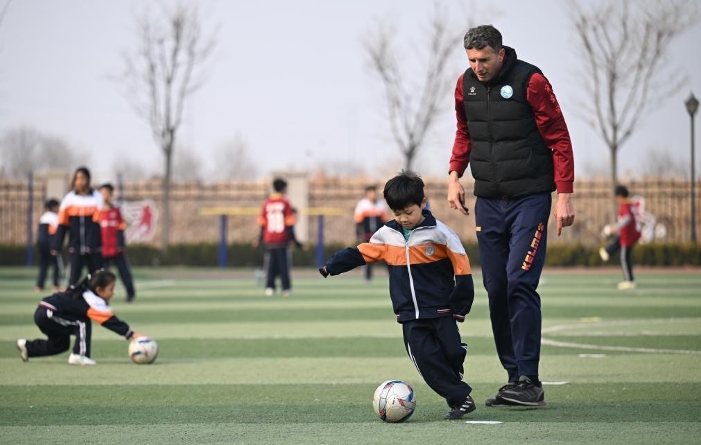 ?亞歷山大·潘蒂奇(右)在天津市靜海區(qū)華康街道第一小學(xué)指導(dǎo)小球員進行足球盤帶(3月6日攝)。新華社記者 孫凡越 攝