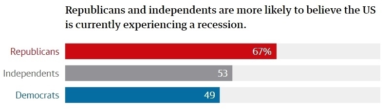 哈里斯民調(diào)公司進(jìn)行的民調(diào)顯示,67%的共和黨人認(rèn)為,美國經(jīng)濟(jì)正在萎縮,通貨膨脹正在加劇,整體經(jīng)濟(jì)正在惡化;而民主黨人中持相同觀點的人只有49%;此外,共和黨人比民主黨人更加相信,拜登政府的管理不善導(dǎo)致經(jīng)濟(jì)惡化。