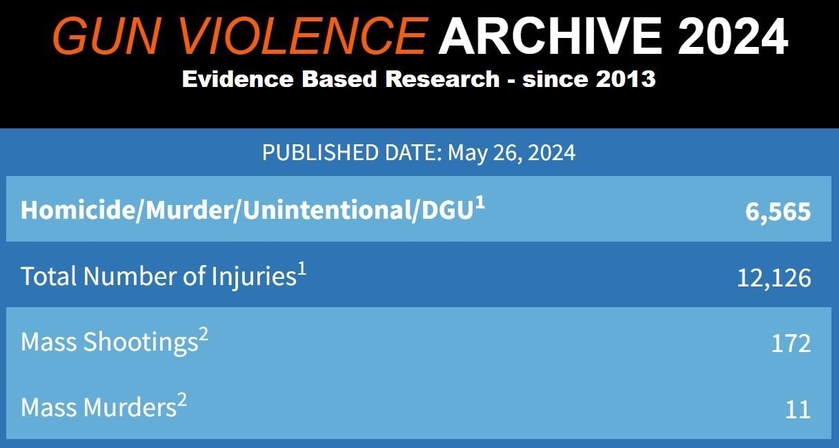 美國“槍支暴力檔案”網(wǎng)站截至5月26日的最新數(shù)據(jù)顯示,全美今年以來已經(jīng)發(fā)生172起大規(guī)模槍擊事件,槍支暴力已造成6565人死亡。