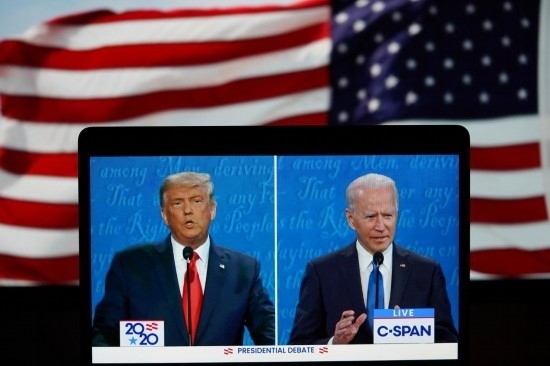 這張2020年10月22日在美國弗吉尼亞州阿靈頓拍攝的視頻畫面顯示,時任美國總統(tǒng)特朗普(左)與民主黨總統(tǒng)候選人拜登在田納西州納什維爾市參加最后一場總統(tǒng)候選人電視辯論。新華社記者劉杰攝