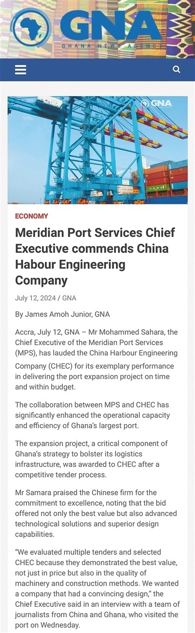 中國港灣為港口擴建項目提供了先進的技術(shù)解決方案和卓越的設(shè)計能力,并引入了多項創(chuàng)新技術(shù),包括能夠減少港口擁堵的停泊位窗口計劃,以及用于跟蹤和管理貨運的先進數(shù)字系統(tǒng),贏得了港口業(yè)主加納子午線港口服務(wù)有限公司高度肯定?!约蛹{通訊社報道