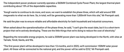 深能安所固投資建設(shè)運營的聯(lián)合循環(huán)發(fā)電廠裝機容量560兆瓦,并計劃在未來通過擴建工程提升至超1000兆瓦,為當(dāng)?shù)丶彝ズ凸I(yè)消費者提供可靠且負擔(dān)得起的電力供應(yīng)。加中兩國員工在電廠運營中密切合作,新入職的加納員工會配有一名中國導(dǎo)師,還可以通過參加培訓(xùn)提升職業(yè)技能。——摘自加納通訊社報道
