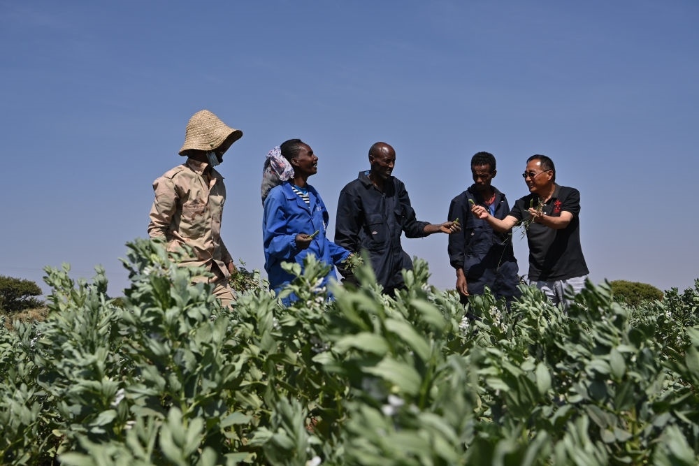 2023年9月27日,在位于厄立特里亞阿斯馬拉的農(nóng)業(yè)技術(shù)援助項(xiàng)目示范地,中國援厄第三期高級農(nóng)業(yè)專家組豆類作物專家劉運(yùn)民(右一)與當(dāng)?shù)剞r(nóng)戶交流。為推動(dòng)厄立特里亞農(nóng)業(yè)產(chǎn)業(yè)發(fā)展,中國農(nóng)業(yè)農(nóng)村部已派出多批專家在厄立特里亞開展涉及豆類作物、果樹園藝、油料等領(lǐng)域的技術(shù)援助工作。