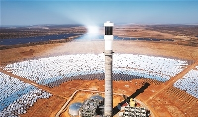 在南非北開(kāi)普省拍攝的南非紅石100兆瓦塔式熔鹽光熱電站項(xiàng)目。新華社記者 張譽(yù)東攝