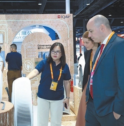 在服貿會首鋼園環(huán)境服務專題展館內,艾可愛爾展臺工作人員為參展觀眾講解空氣凈化整體解決方案。張京飛攝