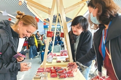 外國(guó)游客在“非遺彝繡秀北京”活動(dòng)期間體驗(yàn)佩戴彝繡工藝品。翁奇羽攝(人民視覺(jué))