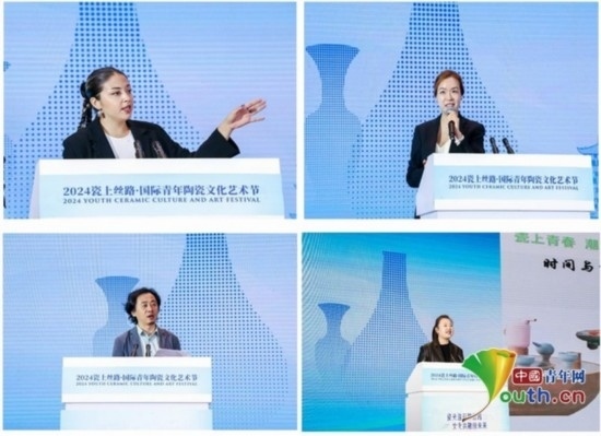 在主題演講環(huán)節(jié),四名陶瓷藝術(shù)領(lǐng)域青年藝術(shù)家代表分別上臺(tái)做了分享。土耳其青年藝術(shù)家佩琳因?qū)μ沾晌幕纳詈衽d趣而來到景德鎮(zhèn),她分享了自己對(duì)陶瓷文化的思考與理解,她認(rèn)為“陶瓷藝術(shù)飽含著人們對(duì)文化多樣性繁榮發(fā)展、美美與共的美好期許”。韓國青年藝術(shù)家宋耎姝以自己的作品《銀之海》為例,和大家分享了創(chuàng)作感悟,她認(rèn)為“陶瓷藝術(shù)創(chuàng)作應(yīng)當(dāng)關(guān)注人與自然的和諧關(guān)系,從大自然中汲取養(yǎng)分”。第十二屆全國青聯(lián)委員、江西省青聯(lián)副主席、國家級(jí)技能大師工作室領(lǐng)辦人歐陽敏致力于陶瓷文化的傳播,他在分享中強(qiáng)調(diào),“陶瓷文化是中華文明與世界文明交流互鑒的橋梁和載體。各國青年應(yīng)當(dāng)做文化傳承創(chuàng)新的踐行者,充分挖掘各國歷史文化的獨(dú)特魅力和時(shí)代價(jià)值,把傳統(tǒng)文化與潮流文化融匯在陶瓷藝術(shù)的創(chuàng)作中,為共同推動(dòng)人類文明發(fā)展進(jìn)步貢獻(xiàn)青春力量。”景德鎮(zhèn)學(xué)院陶瓷美術(shù)與設(shè)計(jì)藝術(shù)學(xué)院院長張博以《陶瓷藝術(shù)在空間中的應(yīng)用》為題,分享了陶瓷文化所代表的中華傳統(tǒng)文化如何與當(dāng)代潮流文化相結(jié)合,共同繪制出一幅幅五彩斑斕的人類文明畫卷。