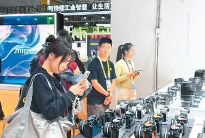 觀眾在進博會尼康相機展臺參觀。本報記者 高 喬攝