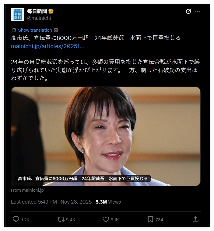 這則新聞的內(nèi)容是,高市早苗在2024年日本自民黨總裁選舉期間,曾瘋狂砸了8384萬日元(約381萬元人民幣)用于宣傳自己,但最終還是輸給了石破茂,而且石破茂的宣傳開銷僅為42萬日元(約1.9萬元人民幣)。