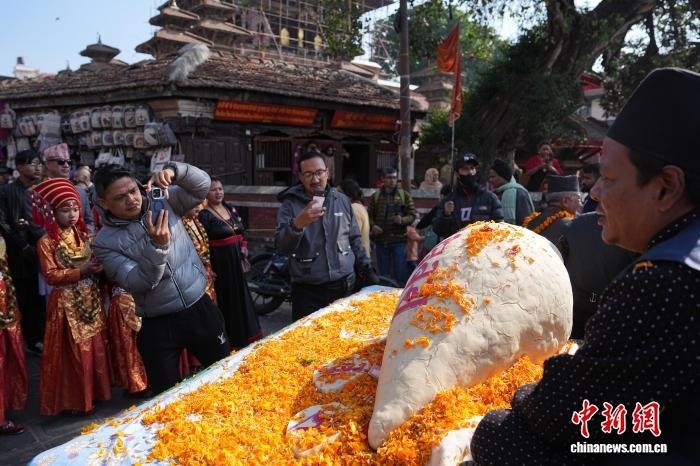 12月4日,尼泊爾加德滿都,尤麻瑞模型吸引民眾拍照。 中新社記者 崔楠 攝