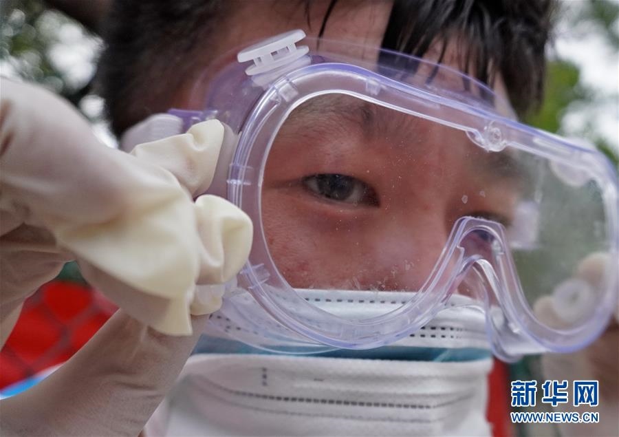 豐臺(tái)區(qū)東高地街道社區(qū)衛(wèi)生服務(wù)中心一位醫(yī)護(hù)人員的護(hù)目鏡內(nèi)流進(jìn)了汗水(6月15日攝)。連日來(lái),北京出現(xiàn)高溫天氣??崾钪?,工作人員堅(jiān)守抗擊疫情一線,成為烈日下的“逆行者”。新華社記者李欣攝