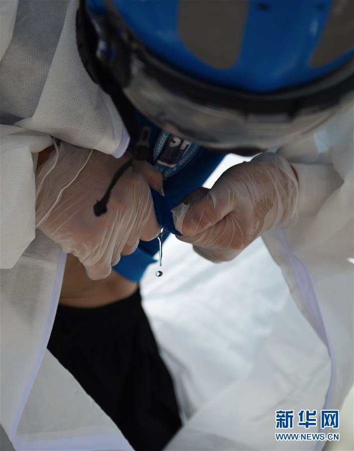 6月16日,北京藍(lán)天救援隊(duì)完成消殺任務(wù)后,一位隊(duì)員的衣服被擰出了汗水。連日來(lái),北京出現(xiàn)高溫天氣??崾钪?,工作人員堅(jiān)守抗擊疫情一線,成為烈日下的“逆行者”。新華社發(fā)(陳鐘昊攝)
