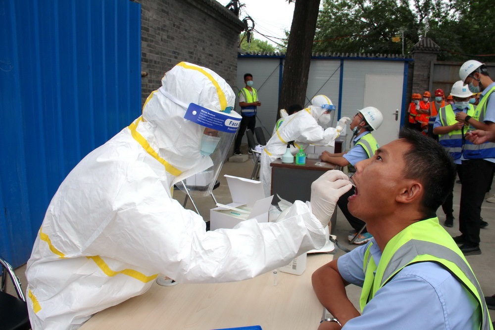 6月15日至17日,中建三局北京公司在京1042名職工做完核酸檢測,同時(shí)公司邀請(qǐng)專業(yè)機(jī)構(gòu)為在建項(xiàng)目的上萬名勞務(wù)工人、安保及物業(yè)管理人員提供上門核酸檢測。新華社發(fā)(柯玉乾攝)