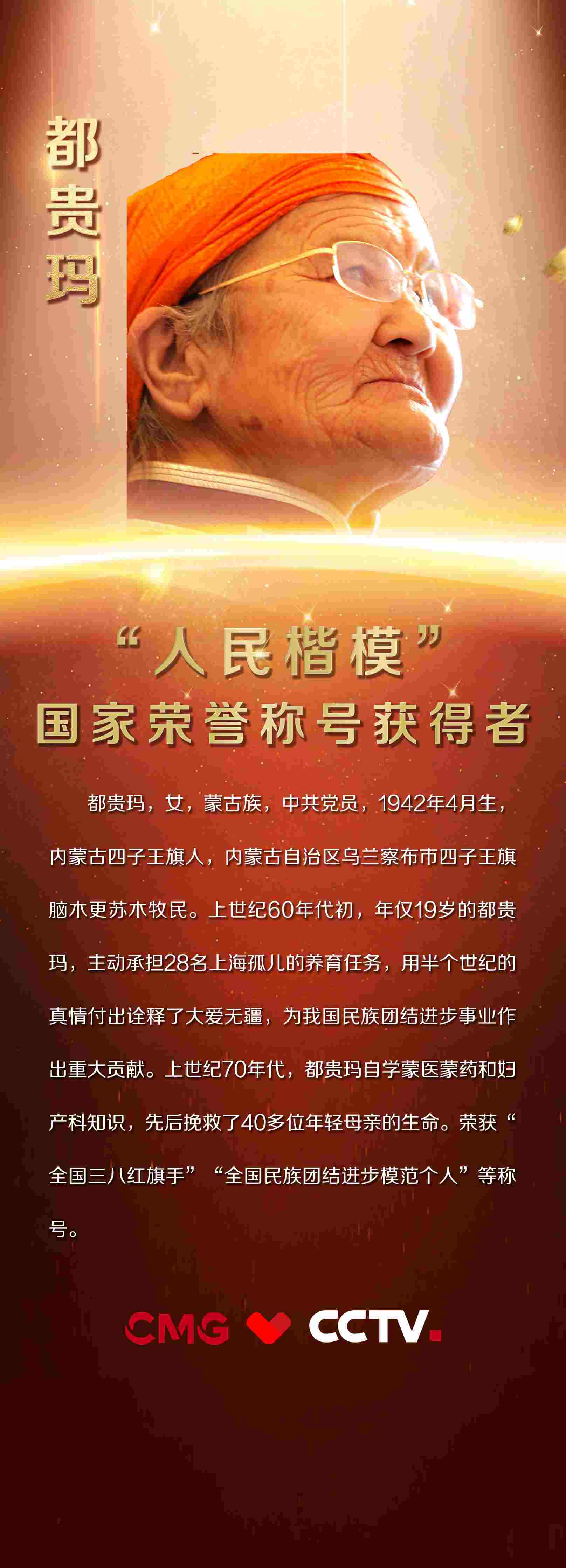 都貴瑪,女,蒙古族,中共黨員,1942年4月生,內(nèi)蒙古四子王旗人,內(nèi)蒙古自治區(qū)烏蘭察布市四子王旗腦木更蘇木牧民。上世紀(jì)60年代初,年僅19歲的都貴瑪,主動(dòng)承擔(dān)28名上海孤兒的養(yǎng)育任務(wù),用半個(gè)世紀(jì)的真情付出詮釋了大愛(ài)無(wú)疆,為我國(guó)民族團(tuán)結(jié)進(jìn)步事業(yè)作出重大貢獻(xiàn)。上世紀(jì)70年代,都貴瑪自學(xué)蒙醫(yī)蒙藥和婦產(chǎn)科知識(shí),先后挽救了40多位年輕母親的生命。榮獲“全國(guó)三八紅旗手”“全國(guó)民族團(tuán)結(jié)進(jìn)步模范個(gè)人”等稱(chēng)號(hào)。